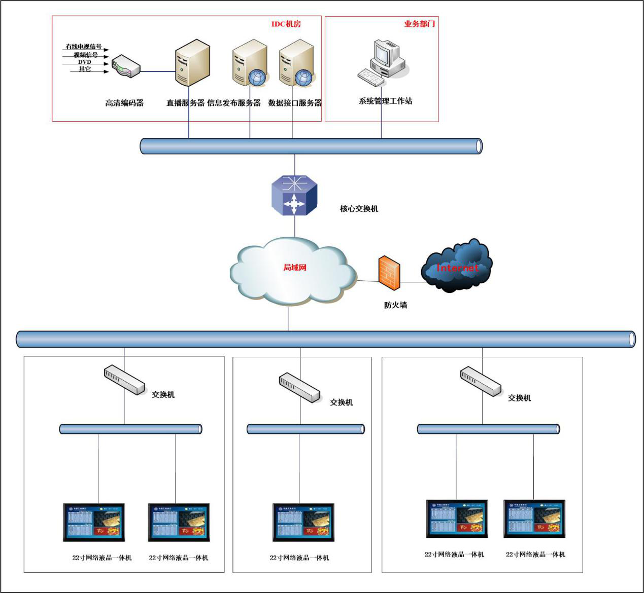 “神州視翰”多媒體顯示系統的硬件由高清直播編碼器、MDS信息發(fā)布服務(wù)器、直播轉發(fā)服務(wù)器、媒體發(fā)布終端(一體機)、網(wǎng)絡(luò )等部分組成,網(wǎng)絡(luò )拓撲結構見(jiàn)下圖所示:
